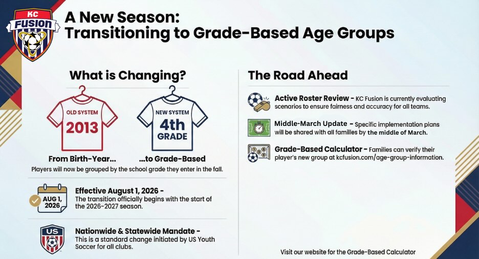 ⚽️ Starting in the 2026–2027 season, the transition from traditional birth-year age groups to a grade-based age group system begins. This means players will be grouped by the school grade they’re entering next fall — aligning with the new US Youth Soccer nationwide standards. 📚⚽️ Learn more and check the age calculators on the KC Fusion website TODAY! #YouthSoccer #FusionFamily